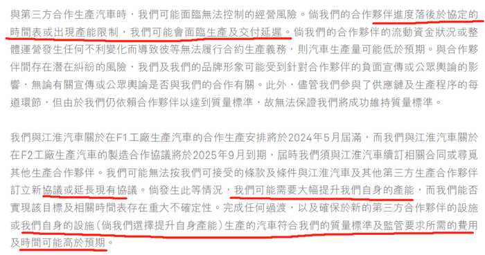 大概理解为蔚来的电动车产能将长期依赖于第三方江淮或其他,生产与交付的能力都是第三方的事情,代工厂出现幺蛾子都会影响蔚来汽车的交付能力;然后,蔚来自建产能短期是不可能的,造不出是一回事,而且这会大大提高蔚来的费用预期。