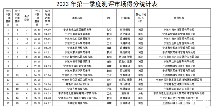 今天,宁波市市场监管局公布了对全市重点农贸市场开展的2023年第一季度长效管理测评结果。