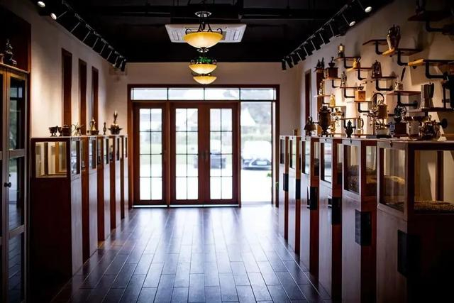 入口处是博物馆招牌式样的收藏展示,不同年代、不同国家的咖啡器具置于架上。一侧透明立柜中还陈列着生豆,经过日晒、水洗、蜜处理等不同处理方式的咖啡豆,展厅另一侧还有完整的古董瓷盘收藏。从这些陈列展示内容看,还挺有点博物馆的架式~