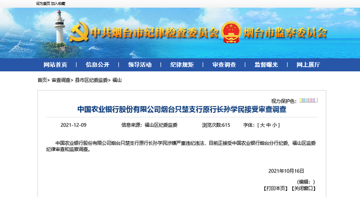 财联社记者查阅相关资料后发现,孙学民系中国农业银行烟台只楚支行原党支部书记、行长,已于2021年10月接受中国农业银行烟台分行纪委、山东省烟台市福山区监委纪律审查和监察调查。