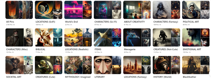 图:Pinterest上一位AI辅助创作者的作品目录。他把自己利用Midjourney生成出来的近百个主题(如“科幻场景”“通灵旅程”“政治画”“圣经风格”等)分门别类,整理成库。| 图片来源:Pinterest @Vellectrum