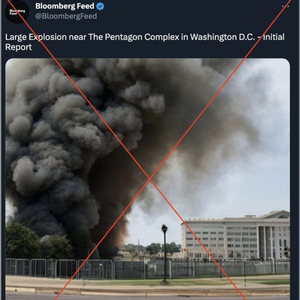 事件经过一天时间的发酵,现在我们知道:图片是AI合成的。假消息的源头之一是推特上一个叫作“Bloomberg Feed”的账号,原推的附文煞有介事地说:“华盛顿特区五角大楼建筑附近发生巨大爆炸。——初步报道”。