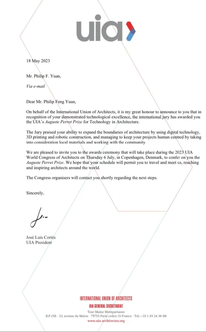 国际建筑师协会(UIA)大奖近日揭晓,其中2023 Auguste Perret建筑技术奖授予同济大学建筑与城市规划学院袁烽教授(全球唯一获奖者),以表彰他“持续推动数字化设计、3D打印以及机器人建造技术研发,并积极将地方材料与社区营造融合,拓展了以人为本的建筑技术边界”。袁烽成为获此奖项的首位中国学者。