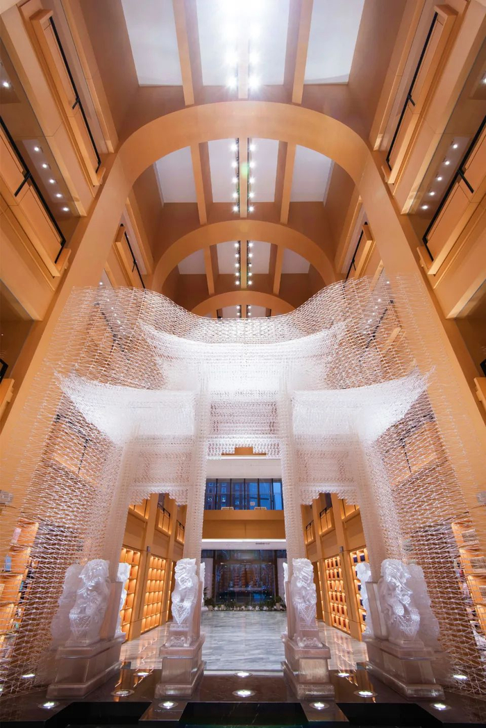 “光启之门”艺术装置也成为了徐家汇书院内很好的信息载体。徐光启先生作为伟大的文化传播者和思想家,开启了西学东渐、东学西传的先河,是世界文化信息交流的一个精神符号。而现在,信息互通方式和模式都发生了巨大的变化,当代的传播特色是强调数据的转换和沉浸的体验,由“光启之门”主体所生长而出“光之翼”的弧面,从两重殿顶的脊线延展开来,使“光启之门”如同一座飘渺的云上仙宫,“云翼”模糊了装置本体在中庭空间中的边界。未来还可通过运用数字投影技术,在“光启之门”及“光之翼”上呈现独特的信息传递体验,以数字技术延展实现无限可能的信息叠加和交流。