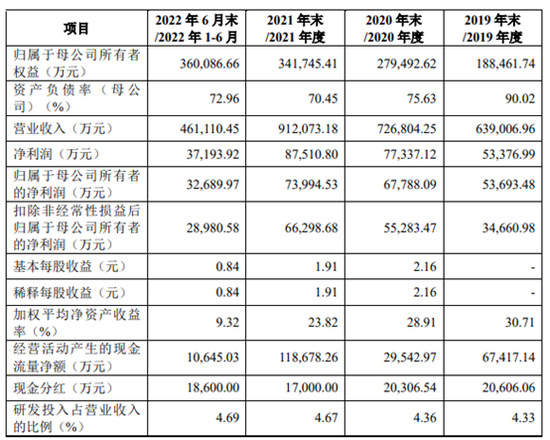 招股书显示,2019-2021年以及2022年上半年(下称“报告期”),人本股份的营业收入分别为63.9亿元、72.68亿元、91.2亿元、46.11亿元,净利分别为5.34亿元、7.73亿元、8.75亿元、3.72亿元,扣非后净利分别为3.47亿元、5.53亿元、6.63亿元、2.9亿元,业绩稳定增长。