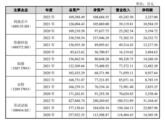 根据2020-2022年度各公司年报,广电计量(002967.SZ)营业收入分别达到18.40亿元、22.47亿元、26.04亿元;苏试试验集团(300416.SZ)营业收入分别为11.85亿元、15.02亿元、18.05亿元;闳康科技分别实现营业收入7.11亿元、7.74亿元、9.03亿元。