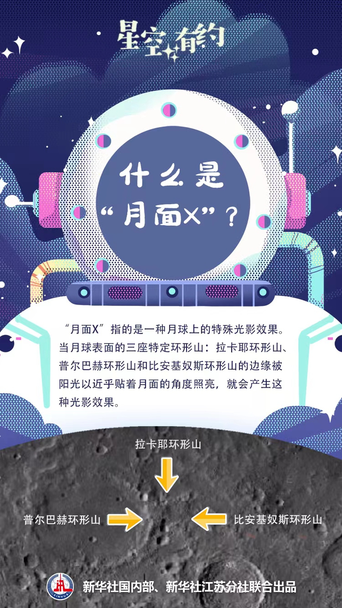 什么是“月面X”?紫金山天文台科普主管王科超介绍,“月面X”指的是一种月球上的特殊光影效果。当月球表面的三座环形山:拉卡耶环形山、普尔巴赫环形山和比安基奴斯环形山的边缘被阳光以近乎贴着月面的角度照亮,就会产生这种特殊的光影效果,即有类似英文字母“X”的形状浮现在月球表面。“月面X”最早于2004年由加拿大观测者发现和报告。此后,这一现象受到许多天文爱好者的持续关注。