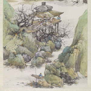 陶冷月《山水册页》中也描绘了山水间梅花盛开的场景,整体以石青色为主,给人以初春的春寒料峭、清冷的感觉。潺潺流水在溪涧流淌,欹倾的梅花在山间盛开,有一种雅致清新的感觉。“春来幽谷水潺潺,的皪梅花草棘间。一夜东风吹石裂,半随飞雪度关山。” 所题诗句出自苏轼《梅花》二首之一,作于因“乌台诗案”被贬黄州的途中。他以生长在荆棘之中因凛冽的东风而飘零飞落的梅花自喻,表达着不与世人同流的高洁和惨遭他人陷害的愤懑。画中带着红头巾的老者,或许正是苏东坡真实的写照,在山水间的小路上倚杖前行,清冷的氛围与其心境恰恰相合。