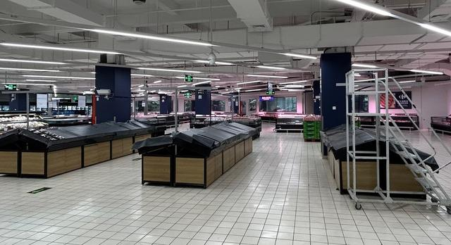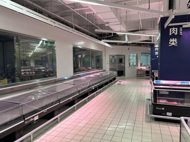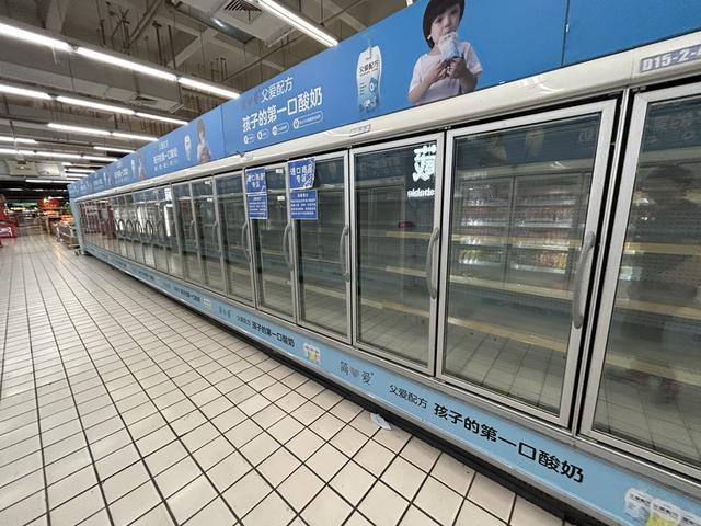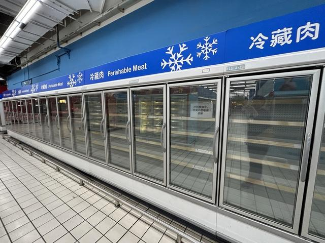 家乐福宝山店中连续数排冷藏酸奶柜、冷藏肉柜处于空置状态。