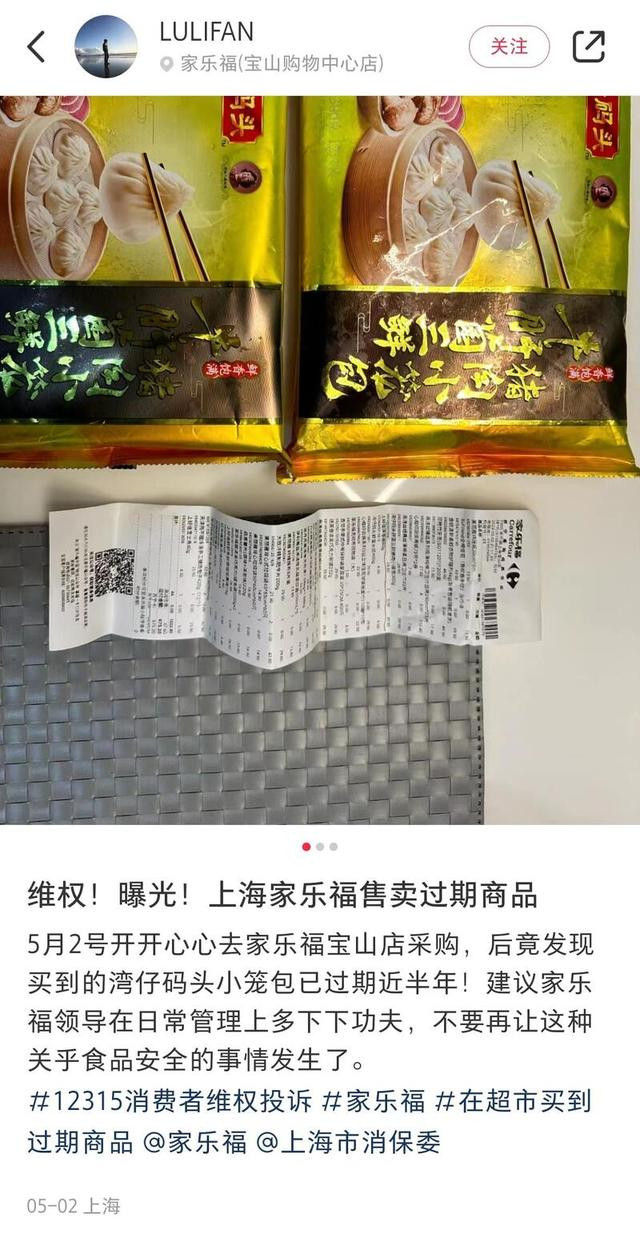 网友“LULIFAN”称,在家乐福宝山店买到了过期近半年的小笼包。