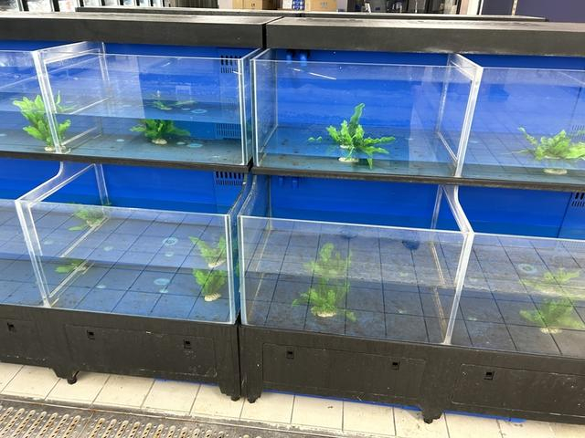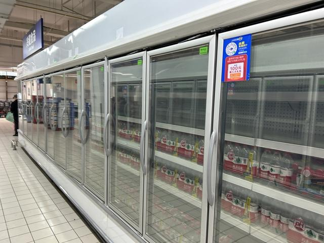 记者也进行了实地走访。家乐福万里店位于普陀区新村路1500号三楼。进入超市内,记者看到,靠近入口的豆制品和蔬菜货架上,摆满了各式商品,基本的品类覆盖比较全面。但继续往里走,记者看到蔬果类后方的连续6排货架呈空置状态,肉类附近的一整排原先售卖新鲜生肉的货架上空无一物,只剩几张蓝色价格签。在烘焙区,三层货架稀稀拉拉地摆放了不到两层饼干,之间都隔着不小距离,货架上方宣传图中的糕点已不售卖了。在水产区,原先售卖蛤蜊、生蚝、鱼虾蟹的玻璃缸中,仅剩了几根装饰水草。收银台附近的一圈货架上是矿泉水,但仅摆放在货架最外一层,背后是大片空白。零售包装食品区域也类似,仅外围摆了一层货品,硬撑着场面,内里是空置状态。在四排标注“冷藏食品”的玻璃柜里,摆放的商品也只有矿泉水,估算有数百箱。记者打开冷藏柜,手探进去发现,冷藏柜并未插电启用,里面是常温状态。在“可口可乐”商标图案的饮料柜里,摆放的也多是矿泉水。
