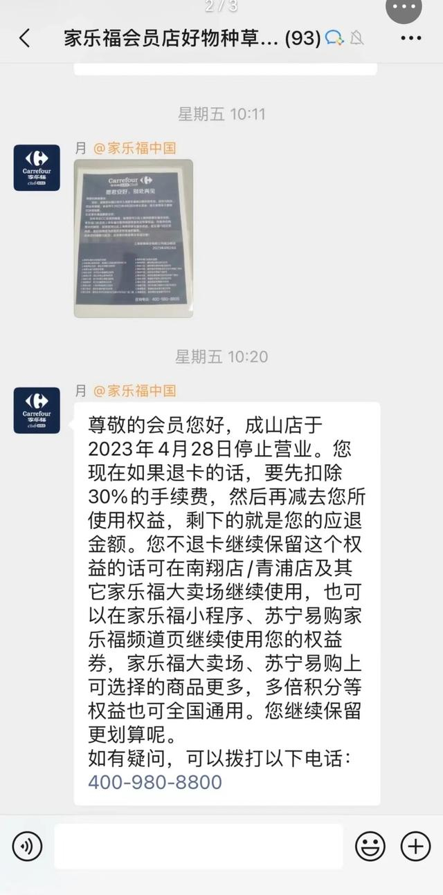 网友“小竹罗”则称,在一个家乐福消费者群中咨询退会员卡事宜,被客服告知如果要退卡需扣除30%的手续费。