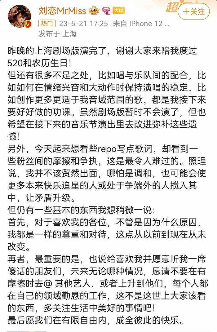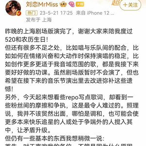 5月21日,Mr.Mss乐队主唱刘恋发文称“看到一些粉丝间的摩擦和争执,这是最令人难过的”,“哪怕是调和,也可能会使更多本来快乐追星的人或处于争端外的人搅入其中,让矛盾升级”。