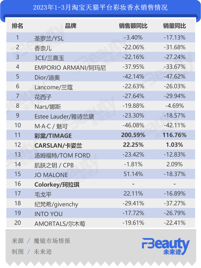 高端彩妆同样下滑明显。数据显示, 在彩妆香水销售额TOP20的榜单中,排名前10的品牌纷纷面临销售额和销量同比的双双下滑,其中除了花西子以外,剩余9个品牌全部为国外高端美妆品牌。不过值得注意的是,两个本土彩妆品牌彩棠和卡姿兰却强势增长,是唯二实现了销售额与销量双增长的品牌。