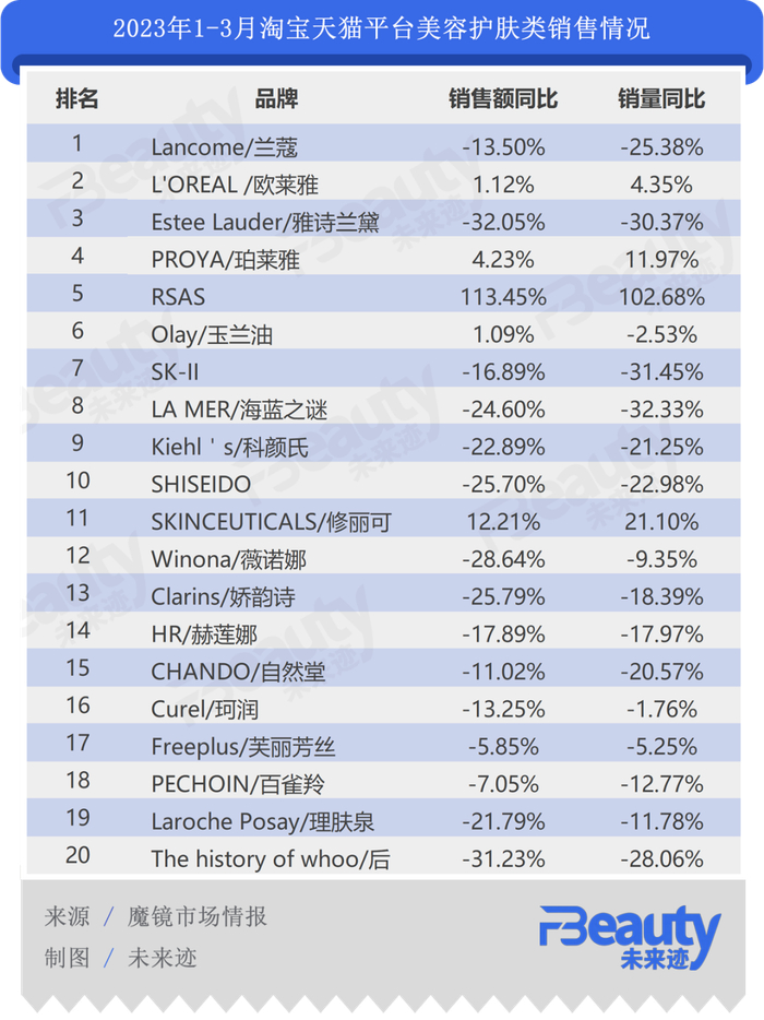 根据魔镜市场情报提供的2023年1-3月美妆线上销售数据,在美容护肤类TOP20品牌排名中,外资高端美妆品牌仅有欧莱雅、修丽可实现了正增长,兰蔻、雅诗兰黛、SK-II、海蓝之谜等、赫莲娜、Whoo后等都有不同程度的下滑。其中,雅诗兰黛、海蓝之谜、科颜氏、资生堂、Whoo后等8个品牌的下滑幅度均超过了20%。