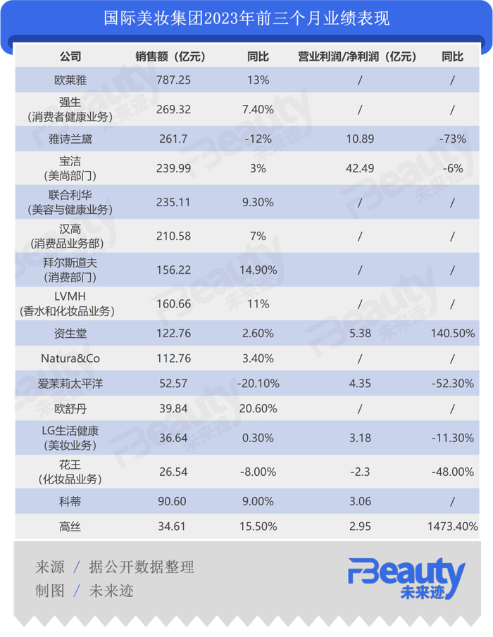 向外看,《FBeauty未来迹》梳理发现,各大国际美妆集团公布的2023年前三个月的业绩报告中,销售额呈现一片增长态势,甚至有集团的净利润同比增长达54亿元之多。但这些上扬的业绩大部分不源于中国市场,美妆巨头们擅长的高端化妆品在一季度的中国表现甚至堪称“惨淡”。
