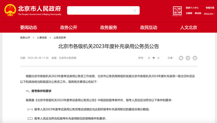 5月26日,北京市各级机关2023年度补充录用公务员公告发布。全文如下: