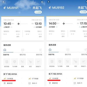 5月28日10:45,东航MU9191将从上海虹桥机场飞往北京首都机场,耗时2小时25分钟,飞机编号为B-919A,这也是全球首架C919的编号。当天14:50,东航MU9192将从北京首都机场飞回上海虹桥机场。