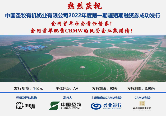 据悉,兴业银行呼和浩特分行2022年落地全国首单社会责任债券——中国圣牧社会责任债券(熊猫债)1亿元,同时配售CRMW,为全国首单标的债务为民营企业熊猫债的CRMW。本笔社会责任债券募集资金用于向偏远农村进行饲料采购,帮扶低收入群体获得稳定收入,助力乡村振兴,对于分行树立“债券银行”的专业品牌形象及践行社会责任的使命担当意义重大。