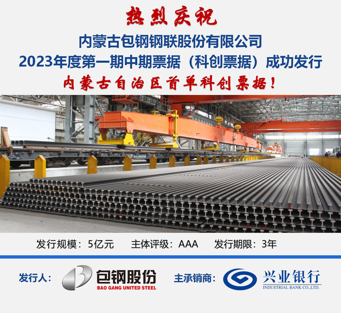 2023年,由兴业银行呼和浩特分行独家主承销的内蒙古包钢钢联股份有限公司2023年第一期中期票据在银行间债券市场成功发行,该笔债券为内蒙古自治区首单科创票据,是分行持续运用创新债券加强对科创企业金融支持的重要体现。