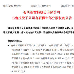 有研新材转让稀土资产超4成股权