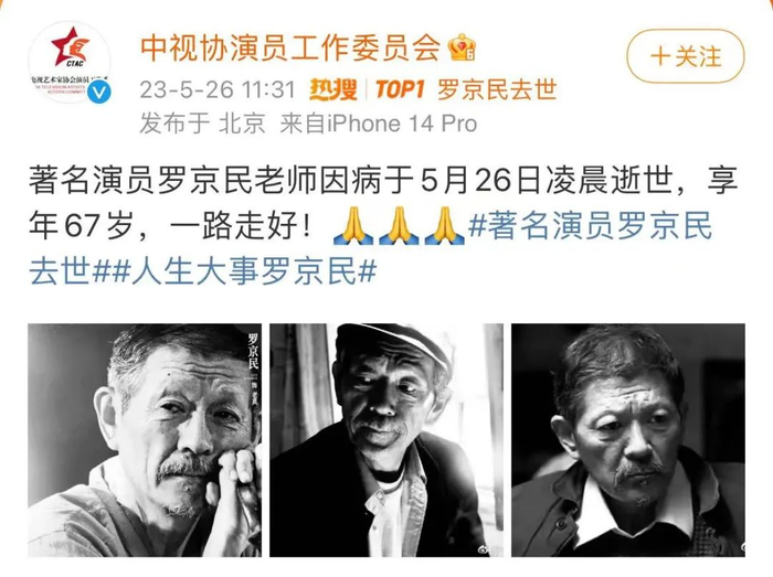5月26日,中国演员工作委员会在官方微博发布消息,著名演员罗京民因病于5月26日凌晨逝世,享年67岁。