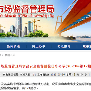 中国质量新闻网讯 2023年5月26日,浙江省舟山市市场监督管理局网站发布食品安全监督抽检信息公示(2023年第12期)。