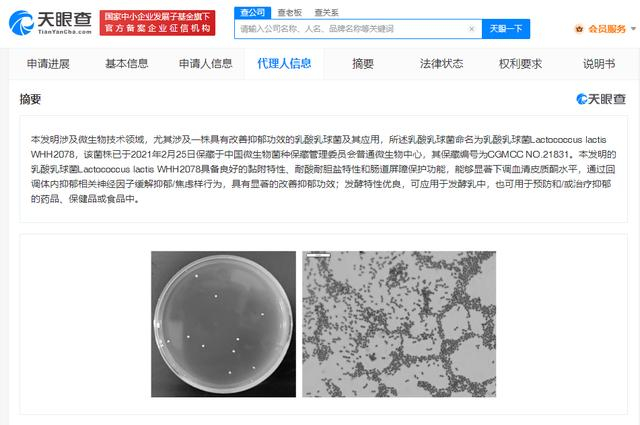 摘要显示,本发明的乳酸乳球菌Lactococcus lactis WHH2078具备良好的黏附特性、耐酸耐胆盐特性和肠道屏障保护功能,能够显著下调血清皮质酮水平,通过回调体内抑郁相关神经因子缓解抑郁/焦虑样行为,具有显著的改善抑郁功效;发酵特性优良,可应用于发酵乳中,也可用于预防和/或治疗抑郁的药品、保健品或食品中。