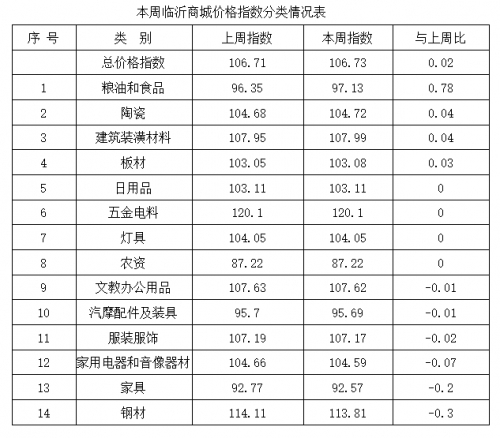 据临沂商城价格指数信息系统监测,本周临沂商城周价格总指数为106.73点,环比上涨0.02点,涨幅0.02%。