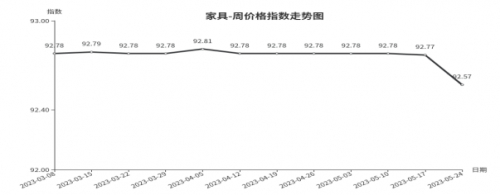 本周家具市场更为冷清,市场客流量较少,货运车辆进出场减少,整体行情偏淡。从交易价格上看,床及用品类、柜类价格下跌较明显,五一过后这种大件家具的销量和价格直线下滑,与商户沟通得知,到店咨询客户在减少,销量受到影响,其他小件家具受影响较小;桌类价格上涨,受益于户外餐饮需求旺盛,带动休闲桌类价格上涨。从具体规格品来看,纳米板/型号3857灰蓝床本周均价1400.00元/张,较上周下跌3.45%;榉木双人床180X220本周均价1600.00元/张,较上周下跌3.03%。