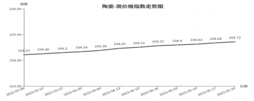 本周,陶瓷类周价格指数收于104.72点,环比上涨0.04点,涨幅0.04%。从指数构成要素看,陶瓷洁具周价格指数小幅上涨,上涨0.17点,涨幅0.15%,成为拉动本周指数上涨的主导因素;建筑陶瓷、日用陶瓷周价格指数保持平稳。