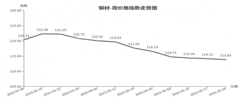 本周,钢材类周价格指数收于113.81点,环比下跌0.30点,跌幅0.26%。从盘面看,三级分类中全部下跌,其中建筑钢材类、型材类、板材类、管材类指数分别下跌0.44点、0.37点、0.32点和0.24点。
