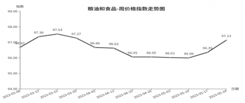 本周,粮油和食品类周价格指数收于97.13点,环比上涨078点。从盘面看,粮油类和调味品类分别上涨0.91点、1.40点,是拉动粮油和食品类周价格指数上涨的主要因素;茶叶类、干果类分别下跌0.14点、0.03点,副食类价格无变化。