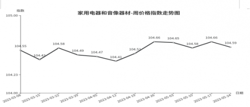 本周,家用电器和音像器材类周价格指数收于104.59点,环比下跌0.07点。二级分类中跌多涨少,仅热水器继续上涨0.04点,其他类电器价格均回落,制冷电器、厨房电器、音像器材、净化电器、电风扇、个人生活电器类指数分别下跌0.30、0.08、0.04、0.04、0.04、0.03点。