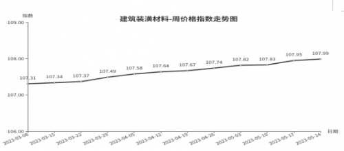 本周建筑装潢材料类指数小幅上涨,五月份市场销售主要面向家庭装饰,以零售为主,墙/地面材料类、塑料阀门管件类、工艺装饰材料类价格小幅上涨,建筑工程类开工不足,工程用量减少。从市场具体规格品看,浙江D518035小碎花墙布价格135元/平方米,上涨3.85%;苏州雅每佳外墙漆价格500元/桶,上涨1.35%;临沂欣大华20PVC穿线管价格1.05元/米,上涨0.96%;浙江飞亚32全塑球阀价格3.64元/个,上涨0.93%;广东佛山萊丽森玻璃胶价格233.29元/箱,上涨0.43%。
