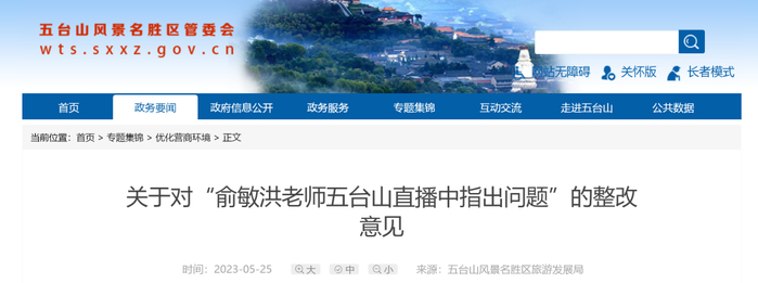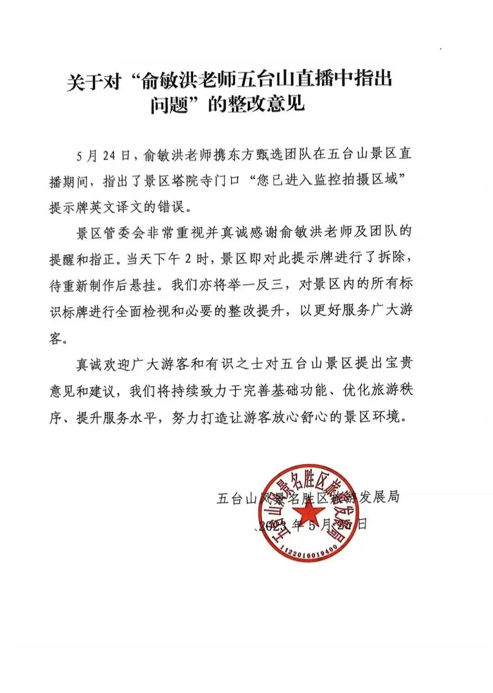 5月25日,五台山风景名胜区旅游发展局立刻发布了关于对“俞敏洪老师五台山直播中指出问题”的整改意见: