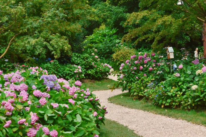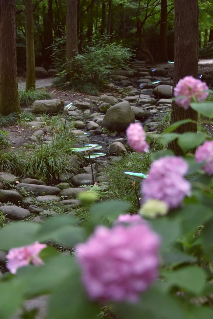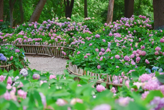 共青森林公园的八仙花园是上海首个八仙花专类主题花园,占地5000余平方米,设有品种展示区、观景区、休闲区等,空间独立幽深,碎石小径通幽,地形起伏优美。