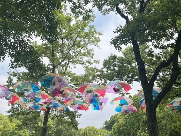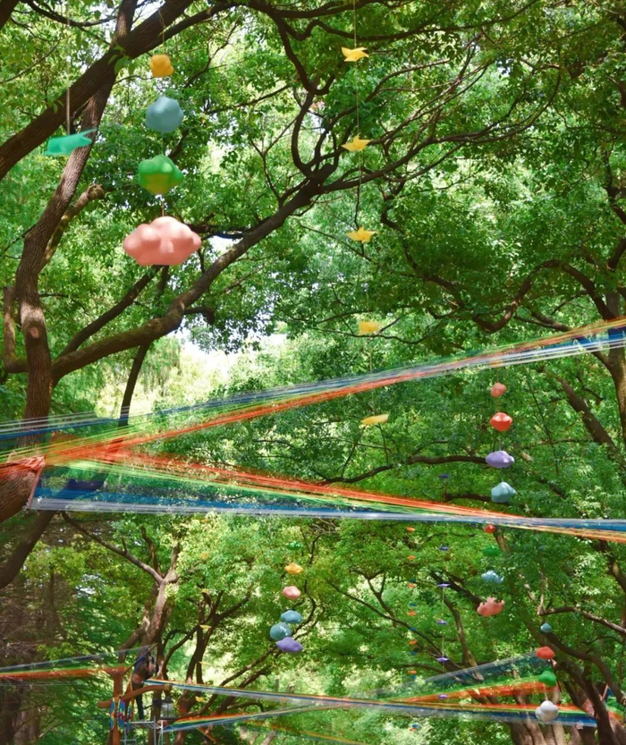 比如西门主干道以穿梭在林间的缤纷彩虹为主线,结合两侧的风车装饰、艺术灯柱、彩色云朵等元素,游客刚入园就仿佛步入阳光明媚的森林童话世界。静止的彩虹与转动的风车、浮动的云朵动静结合,与树影婆娑的公园相得益彰。