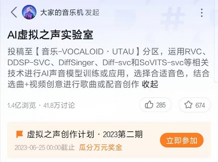 近日,B站音乐区推出了“虚拟之声创作计划”,话题“AI虚拟之声实验室”鼓励用户进行AI声音模型训练或应用,浏览量1.4亿,讨论量41.8万。