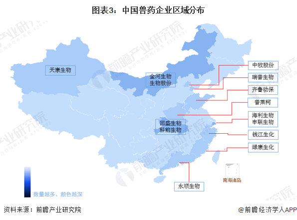在全国范围内,兽药行业企业分布广泛,其中长三角、中部、华南地区及内蒙古自治区一带相对更为集中。长三角地区的代表企业包括海利生物、钱江生化等;中部地区河南、湖北省落户有回盛生物、科前生物、普莱柯等。