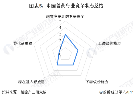 从五力竞争模型角度分析,目前我国兽药行业出现了较多大企业,市场秩序逐步建立,竞争强度一般。上游行业工艺日趋成熟,技术水平和产品质量不断提高,产品种类齐全,市场供给充足,供应商议价能力一般;下游行业涉及畜牧业、养殖业等终端市场,客户数量较多,消费者议价能力一般。发展多年以来,兽药市场已基本成型,消费市场随着畜牧业等终端市场的发展日益增加,替代品威胁较小。同时,在目前的兽药市场当中,市场监管进一步严格,资格认证及审查标准更为严苛,行业壁垒提高,尽管行业整体的盈利能力较强,具有一定吸引力,但行业潜在进入者威胁不大。