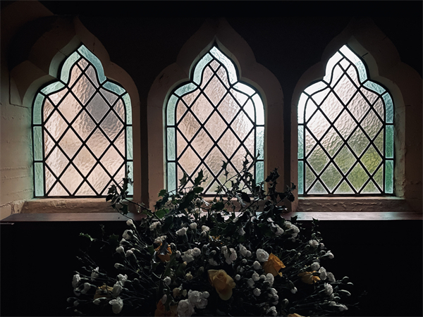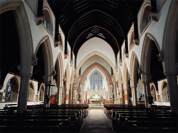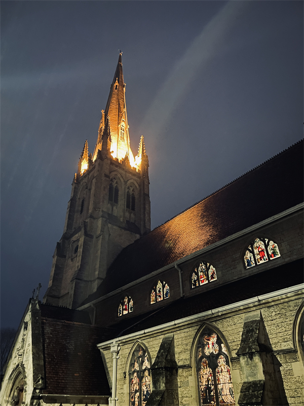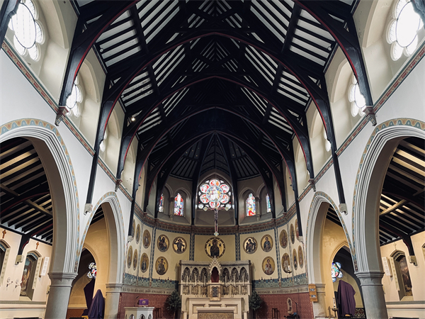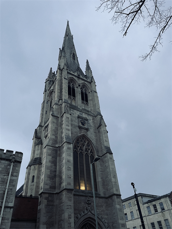 圣格雷戈里堂在切尔滕纳姆的核心商业区外围,是一座哥特复兴建筑,有着精美的高塔,属于英国二级历史保护建筑。一路寻过去时,雨势渐大,整个街区没人在外走,暮色中显得有些阴郁。本以为也是不开放的,没想到绕到正面,门却一推就开了。这是个小小的门廊,没有开灯,在黑暗中坐了一会儿,只有外面的雨声和偶尔路过的汽车声提醒我世界依然存在。试着去推通往教堂内部的大门,原来也是开着的。内部空间只有正前方的祭坛区域亮着灯,一排排座椅以及上面木质拱券处于黑暗中,平添出一种异世感。等我一个人将那些彩色玻璃窗看了一遍,倒是有人来开了大厅的灯,原来晚祷时间临近了,但完全亮起来的大厅似乎失去了某种“魔力”。