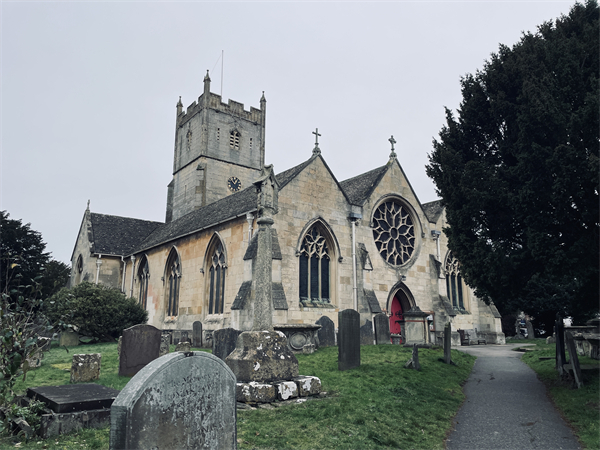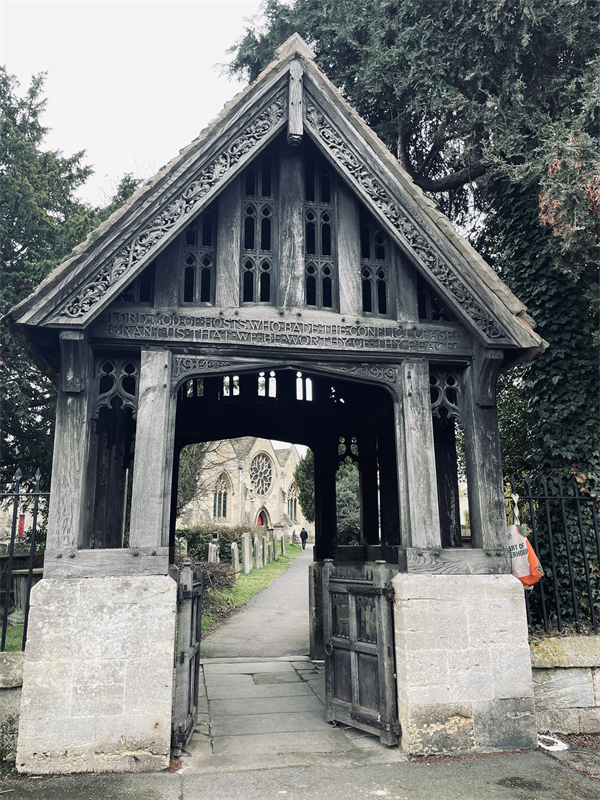 1913年1月3日是托尔金21岁生日,零点刚过,他便提笔给伊迪丝写信,倾诉自己三年来从未忘记的爱,并请求她嫁给他。然而,伊迪丝回信说,她已和校友的哥哥乔治·菲尔德(George Field)订婚。这三年中,伊迪丝跟着杰索普夫妇住在切尔滕纳姆的一个“卫星城”查尔顿金斯(Charlton Kings),她能每天练习钢琴,并开始为附近圣公会的圣玛丽教堂(St Mary's Church)演奏,还参与教会事务,在唱诗班外出表演时帮忙。这座建于1190年的古老教堂今天依然伫立在一个交通环岛上,周围树木成荫,草地上散布着不同时期的墓碑,有些已经布满青苔,看不出字迹。遗憾的是,这个元旦中午,教堂并没有开门,绕着它走一圈,倒是有种时间凝滞感,仿佛与周围的道路、不断变化的城市分处两个时空。