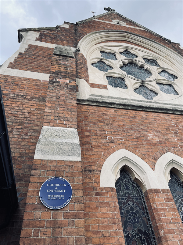 去桥上走了一圈,然后回到城堡前的街道,奇怪的是路上竟空无一人,先前那么多的游客像是凭空消失了,或许这就是当代旅游城市的悲哀吧,游人散去,终显落寞。无论如何,沿路向西步行十来分钟,就是圣玛丽无原罪天主教堂,2019年,一块纪念托尔金和伊迪丝婚礼的蓝牌挂到了外墙上。除此之外,其外观和内饰都颇为平淡,实在是这一日探访的反高潮式结尾。转向北回火车站的路上,还能路过伊迪丝在1913至1916年居住的那个家,维多利亚街15号,当时刚建造不满十年的时髦联排别墅。两人在教堂正式订婚后,托尔金很可能也把这里当作自己的安全港湾,即便他大部分时间还是在牛津。如今,这里百叶窗紧闭,门口插着待售的牌子,不知道它会不会有下一任主人,在某个灰色港口目送精灵的白船,然后对等待的家人说,“啊,我回来了。”