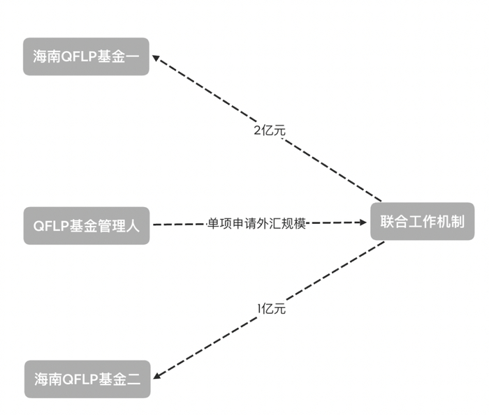 1.传统模式:在《洋浦QFLP外汇实施细则》出台前,绝大多数非试点地区均未实行余额管理制度,也即基金管理人需要就每一只QFLP基金单独申请外汇额度,且每只基金之间额度是相互独立的,不能由基金管理人自由分配,具体如下图: