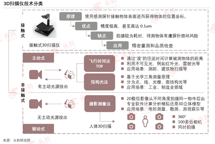 非接触式3D扫描仪在市场上更普遍,非接触式3D扫描仪通过激光或辐射来获取扫描对象空间信息。非接触式3D扫描又可根据是否有主动光源投出分为主动式和被动式。
