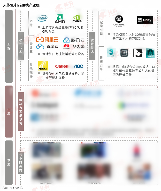 人体3D扫描上游包括芯片、云计算和扫描设备等在内的硬件技术,渲染引擎和建模引擎在内的软件技术;中游是解决方案提供商,应用于下游市场、文旅、3D建模等行业应用。