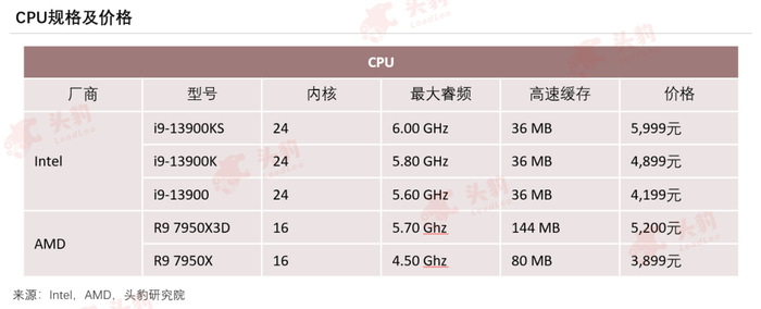 在产品价格上,英特尔的“酷睿”系列价格也相对高于AMD的“骁龙”系列,用于笔记本的最新款13代酷睿i9处理器价格从4,199元到5,999元,而新款骁龙R9 7950的价格从3,899元到5,200元。产品规格上,“酷睿”系列在内核数量和最大睿频的表现上都更加优秀,拥有24个核心,最大睿频达到6.00 GHz,“骁龙”系列在高速缓存上更胜一筹,高速缓存最高可达144MB。