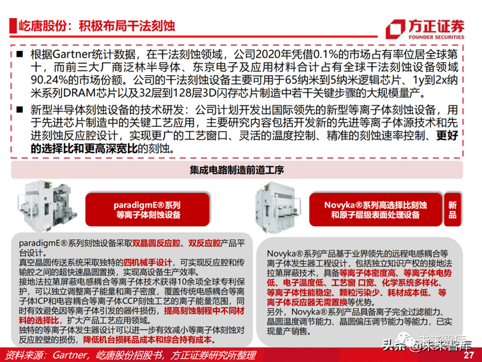 根据Gartner统计数据,在干法刻蚀领域,公司2020年凭借0.1%的市场占有率位居全球第 十,而前三大厂商泛林半导体、东京电子及应用材料合计占有全球干法刻蚀设备领域 90.24%的市场份额。公司的干法刻蚀设备主要可用于65纳米到5纳米逻辑芯片、1y到2x纳 米系列DRAM芯片以及32层到128层3D闪存芯片制造中若干关键步骤的大规模量产。新型半导体刻蚀设备的技术研发:公司计划开发出国际领先的新型等离子体刻蚀设备,用 于先进芯片制造中的关键工艺应用,主要研究内容包括开发新的先进等离子体源技术和先 进刻蚀反应腔设计,实现更广的工艺窗口、灵活的温度控制、精准的刻蚀速率控制、更好 的选择比和更高深宽比的刻蚀。