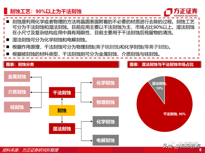 刻蚀是利用化学或者物理的方法将晶圆表面附着的不必要的材质进行去除的过程。刻蚀工艺 可分为干法刻蚀和湿法刻蚀。目前应用主要以干法刻蚀为主,市场占比90%以上。湿法刻蚀 在小尺寸及复杂结构应用中具有局限性,目前主要用于干法刻蚀后残留物的清洗。湿法刻蚀可分为化学刻蚀和电解刻蚀。根据作用原理,干法刻蚀可分为物理刻蚀(离子铣刻蚀)和化学刻蚀(等离子刻蚀)。根据被刻蚀的材料类型,干法刻蚀则可分为金属刻蚀、介质刻蚀与硅刻蚀。
